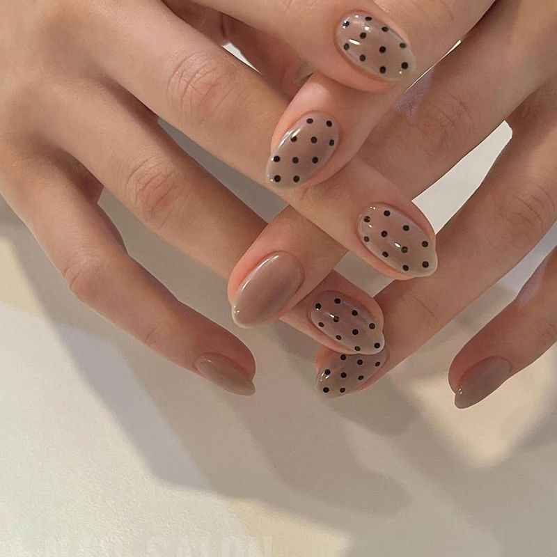 Горошки на ногтях — попытка хоть немного задержать лето с его легкостью и отпускным вайбом. Но если летом горошки были более крупными и яркими, на осень нам предлагают модные покрытия для ногтей с пастельным горошком на спокойном фоне бежевых и тех же шоколадных оттенках какао.