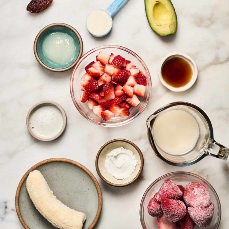 1. В блендер поместите миндальное молоко, замороженную клубнику, авокадо, коллаген и водоросли.